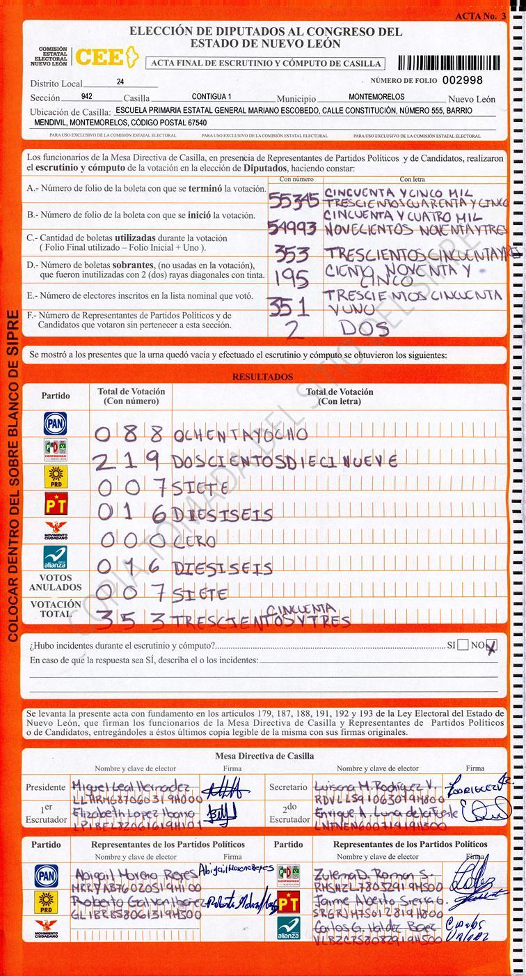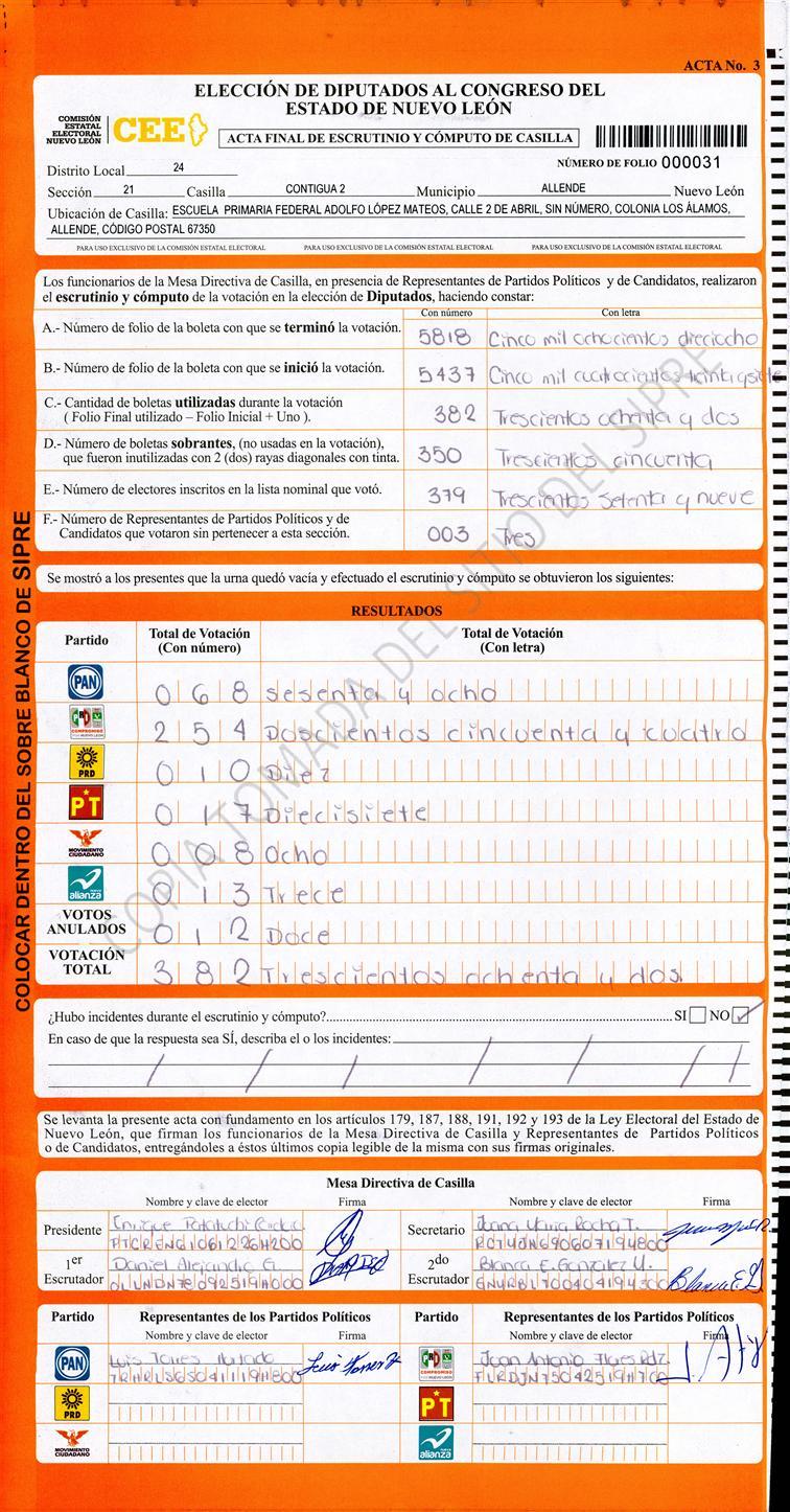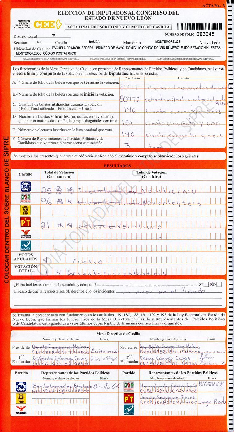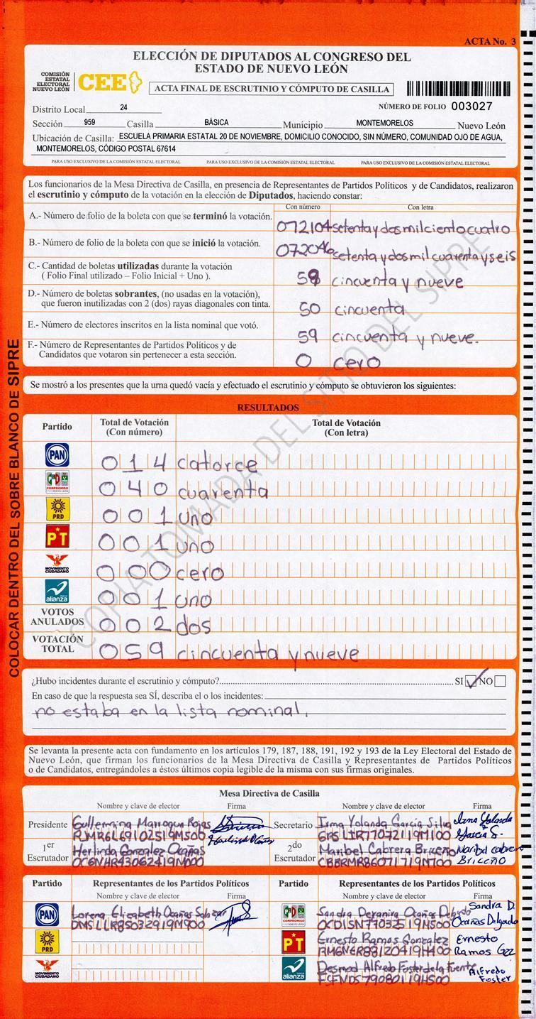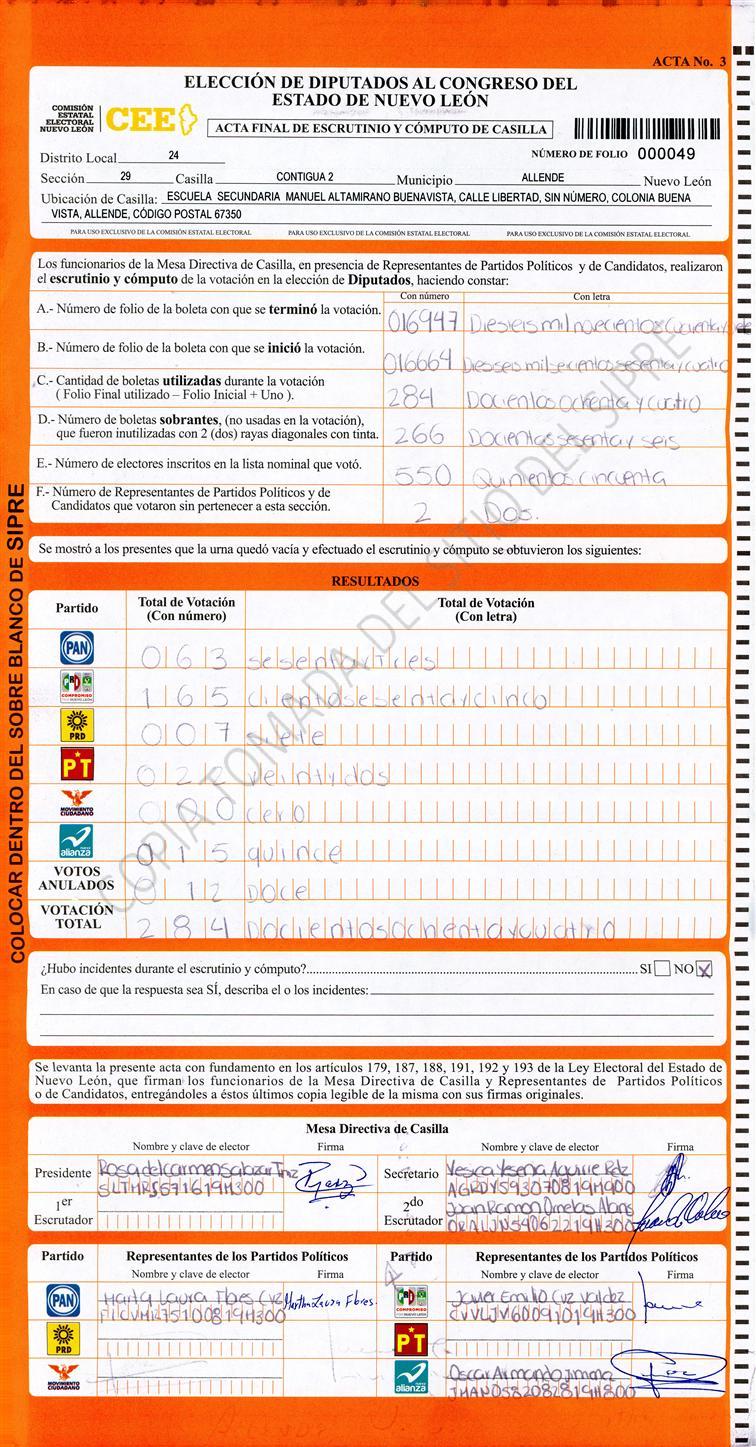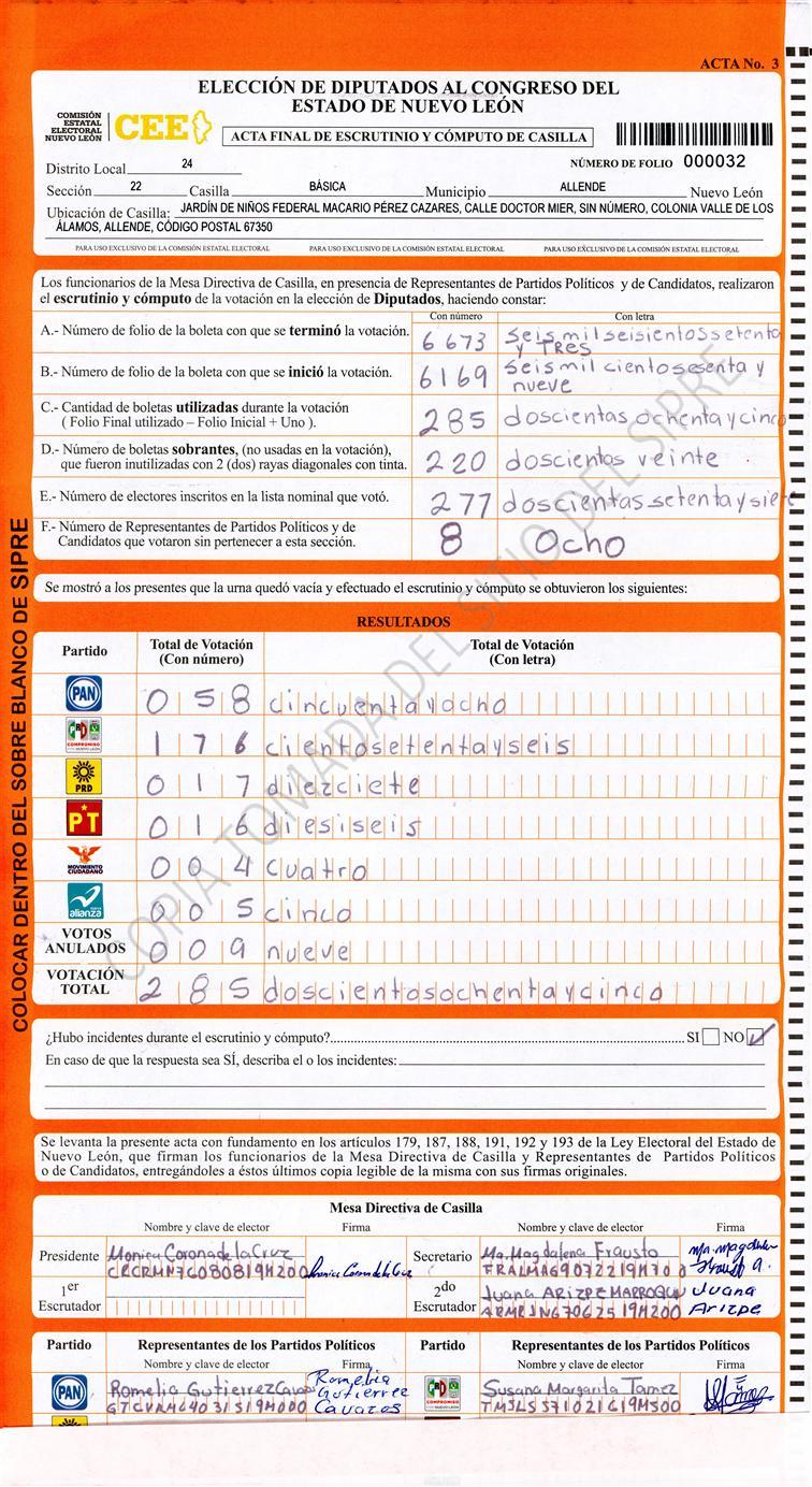 , (8) Copiado Movido , (9) Con Signos Inválidos , (10) Excede Lista Nominal , (11) Otra |
